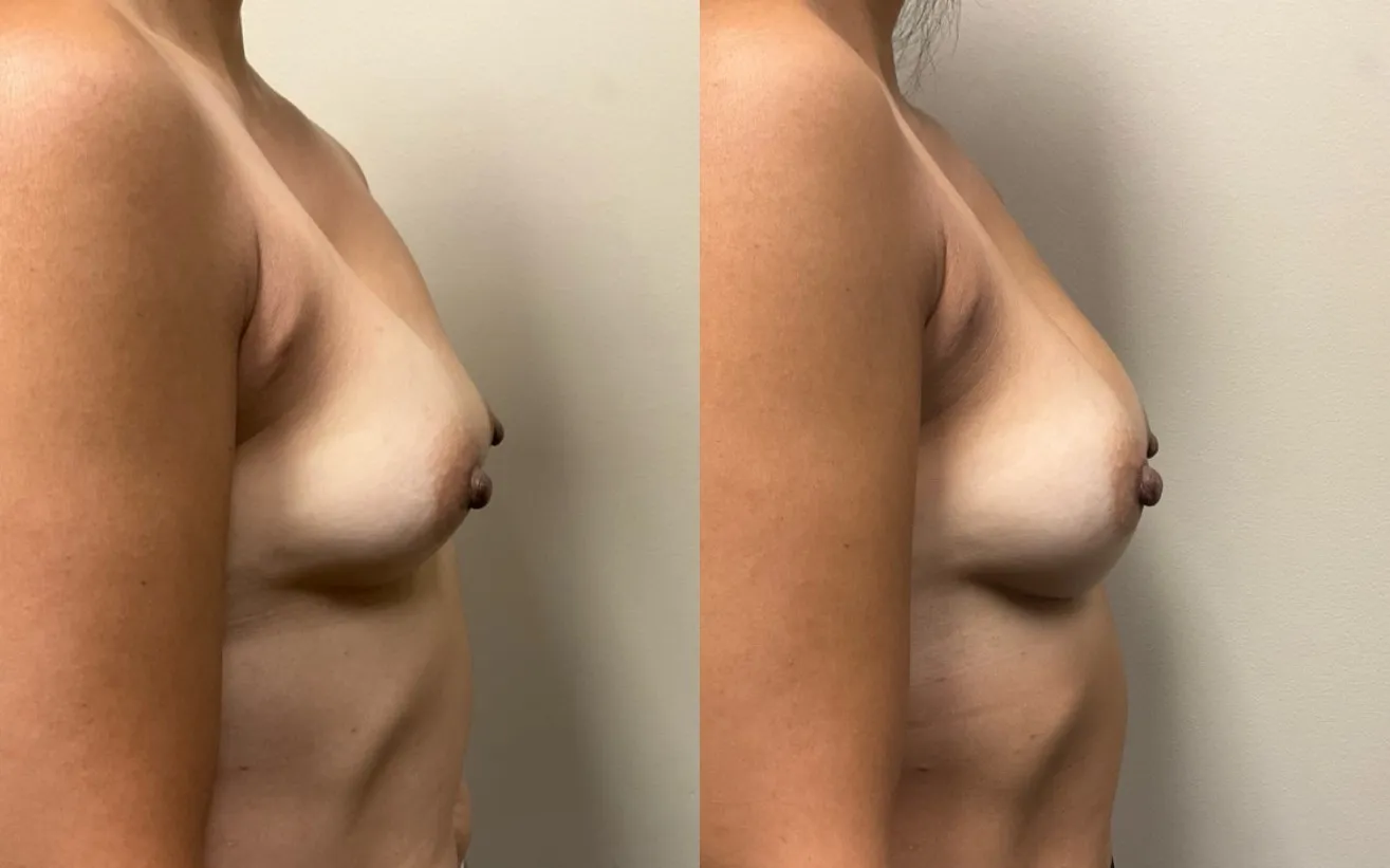 This is a 54 year old female who had subpectoral saline implants (180 cc) for many years. The left implant ruptured and she underwent implant exchange (Motiva, 205 cc, demi profile) with capsulotomies. The patient is shown 5 months postoperatively.