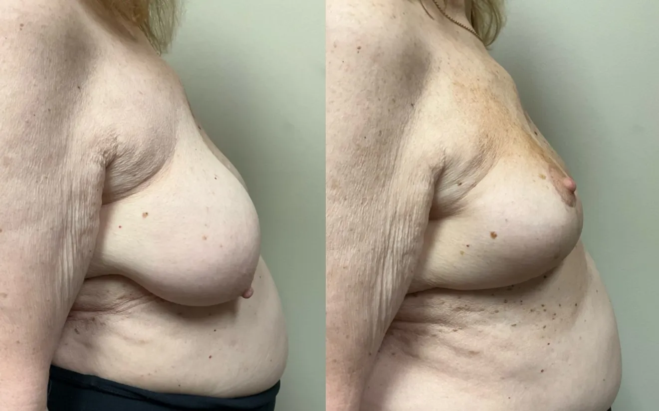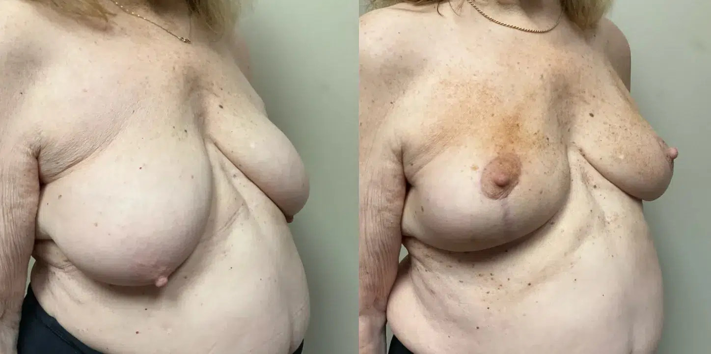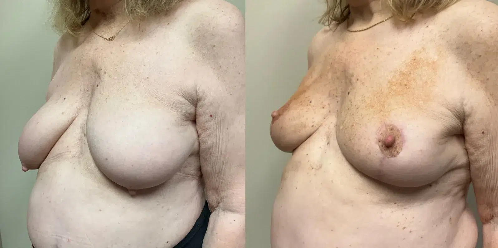 This is an 81 year old female who desired improvement in the appearance of the breasts. She is shown 4 months from bilateral mastopexy using an inverted-T incision pattern.